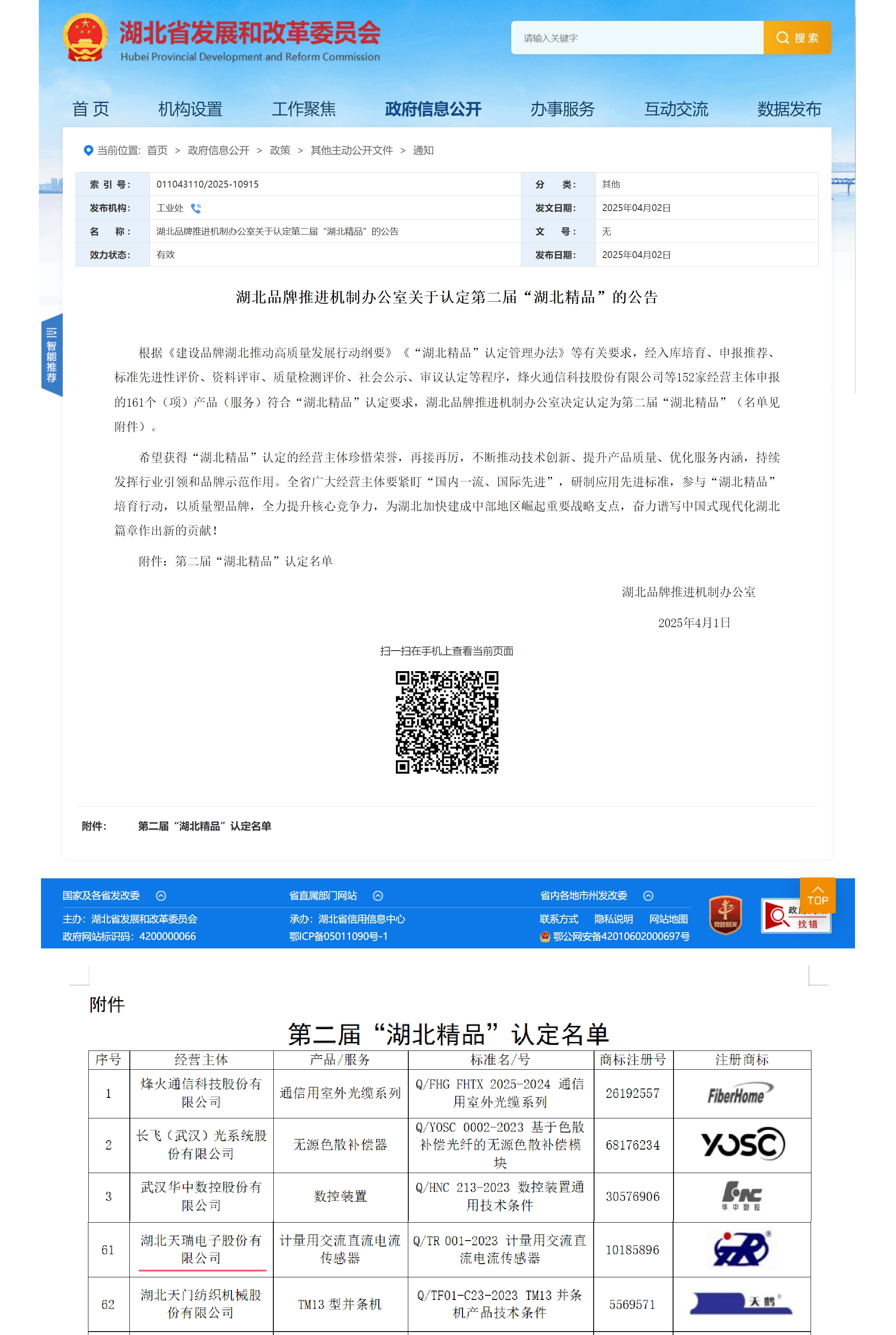 ‌       2025年4月2日,天门讯‌——近日,湖北省发展和改革委员会官网发布《湖北品牌推进机制办公室关于认定第二届“湖北精品”的公告》,湖北天瑞电子股份有限公司(以下简称“天瑞电子(837601.NQ)”)自主研发的“计量用交流直流电流传感器”凭借其卓越的技术创新性、产品可靠性和市场竞争力,成功入选第二届“湖北精品”名单。这是继公司多项产品获国家级、省级荣誉后,在品牌建设和质量提升领域取得的又一重要突破。