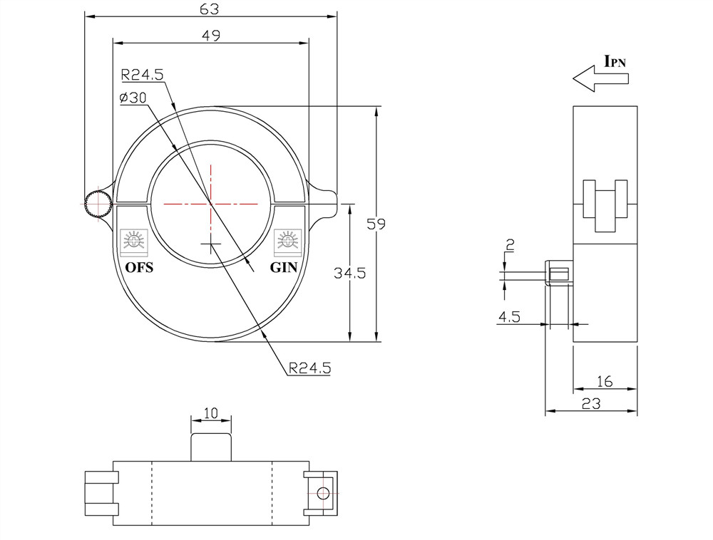 该传感器采用直测式霍尔检测原理工作。原边电流产生的磁通量聚集在磁电路中,并由霍尔器件检测出霍尔电压信号,经过放大器放大,该电压信号精准的反应原边电流。